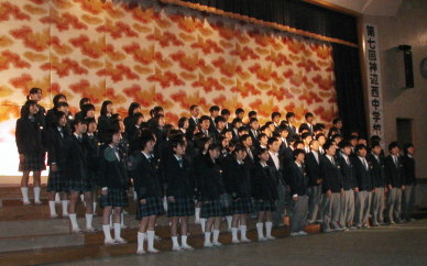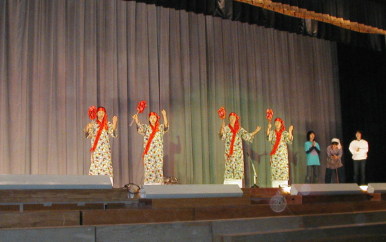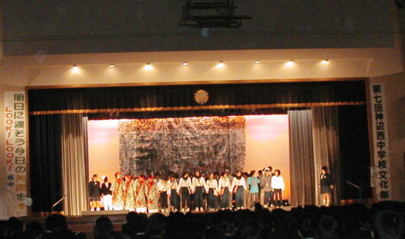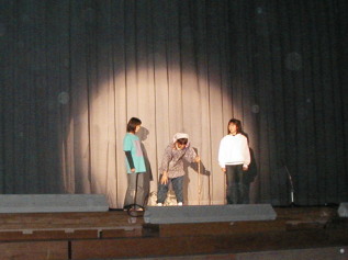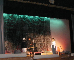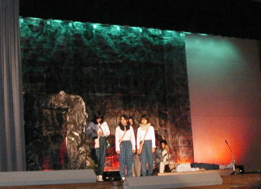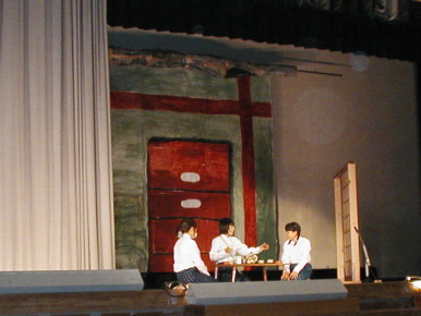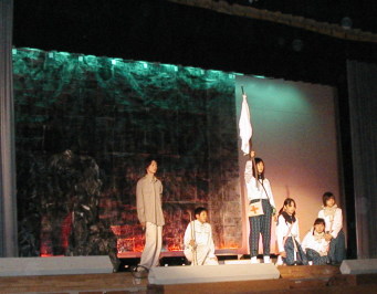 3年生の劇は沖縄民謡から始まり、1人の老婆が子ども達にどうしても忘れられない辛い思いでを語りはじめます。学徒動員で、女学生は看護婦として、兵隊さんの看護にあたっています。戦闘にまきこまれたり、また日本兵が自分達の身を守るためにこの子達を殺したり、と彼女達はいろんな体験を通して、自分達が生きてこの沖縄をそして、自分達の大切な人々を守っていかなければいけない、と言う事に気付き、「ムチドゥタカラ 命こそ宝」と叫びながら、隠れていた洞窟から白旗を掲げて、生きるために前に進んでいく。と言う物語でした。