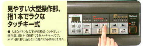 大きなボタンと文字が高齢者にもやさしい操作部。指一本で操作できるタッチキー式で