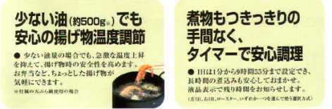 少ない油量の場合でも、急激な温度上昇を抑えて、揚げ物時の安全性を高めます。