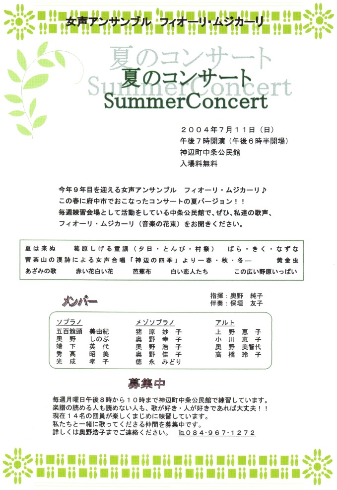 このたび、7月11日(日曜日)午後7時から神辺町中条公民館においてフィオーリ・ムジカーリのミニコンサートを開きます。府中のコンサートの夏バージョンです。