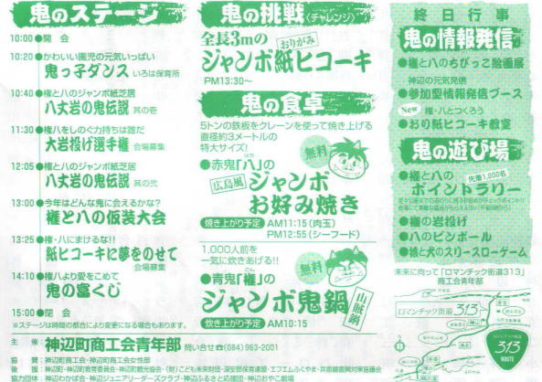 5メートルの鉄板をクレーンを使って焼き上げる直径約3メートルの、広島風ジャンボお好み焼きや、2000人前を一気に炊き上げる青鬼「権」の山賊鍋ジャンボ鬼鍋も作られます。10:00の開会式から、15:00の閉会式まで、いろんな催し物を計画しています。ぜひ見に来てください。