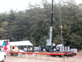 ![]() 直径約3mのジャンボお好み焼きの準備風景です。 すでに、上と下の鉄板が数本のプロパンを使ってあたためられていました。 |