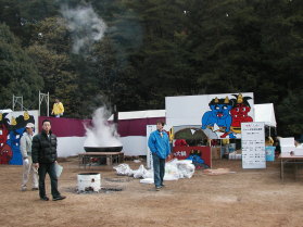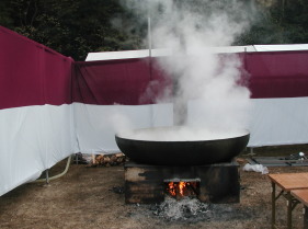 ![]() 2000人前のジャンボ鬼鍋に使う鉄鍋からは、湯気が出ています。これから材料を入れるようです。 |